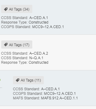 We recommend using standards as tags to help narrow down the search results. For assessment questions, use tag Item Type Assessment. For interactive practice problem questions, use tag Item Type Worksheet. When you enter a tag keyword in the field, give the interface a few seconds to return matching tag names and values.