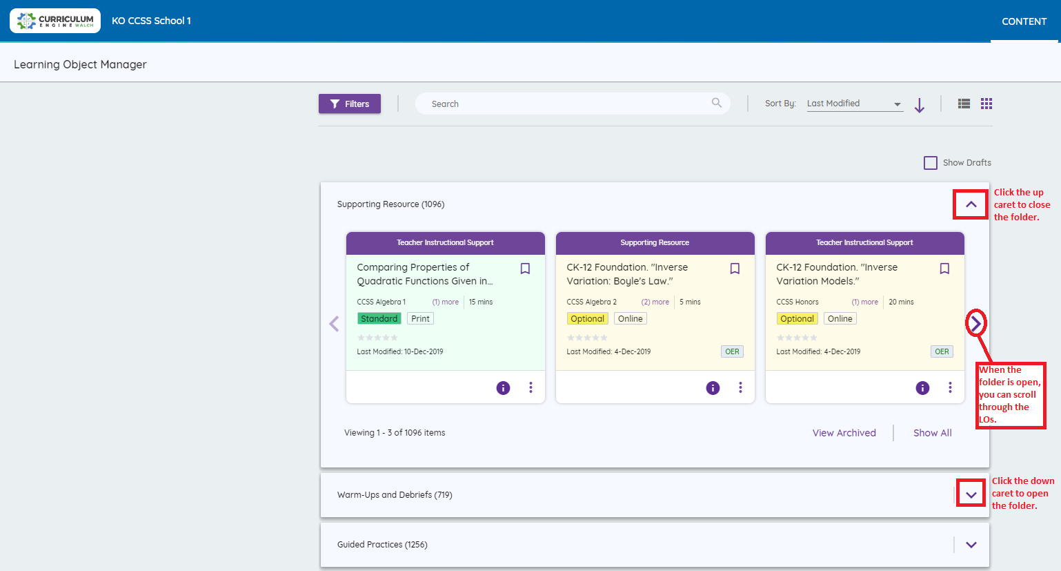 To navigate, click the down caret to open a folder and the up caret to collapse it. When the folder is open, you can scroll through the learning objects of that type. You can view the learning objects in either grid or list mode. See Learning Object Manager | Grid and list display options for more information.