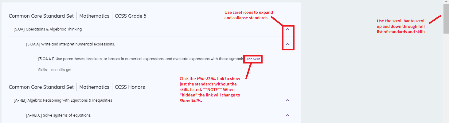 - Click the Hide Skills / Show Skills link to hide or display the skills associated with each standard.