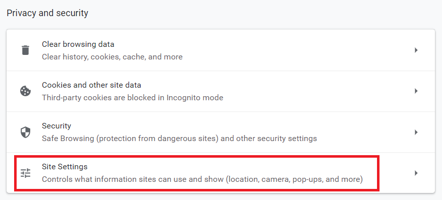 4) Under Privacy and Security, click on the Site Settings option to open: