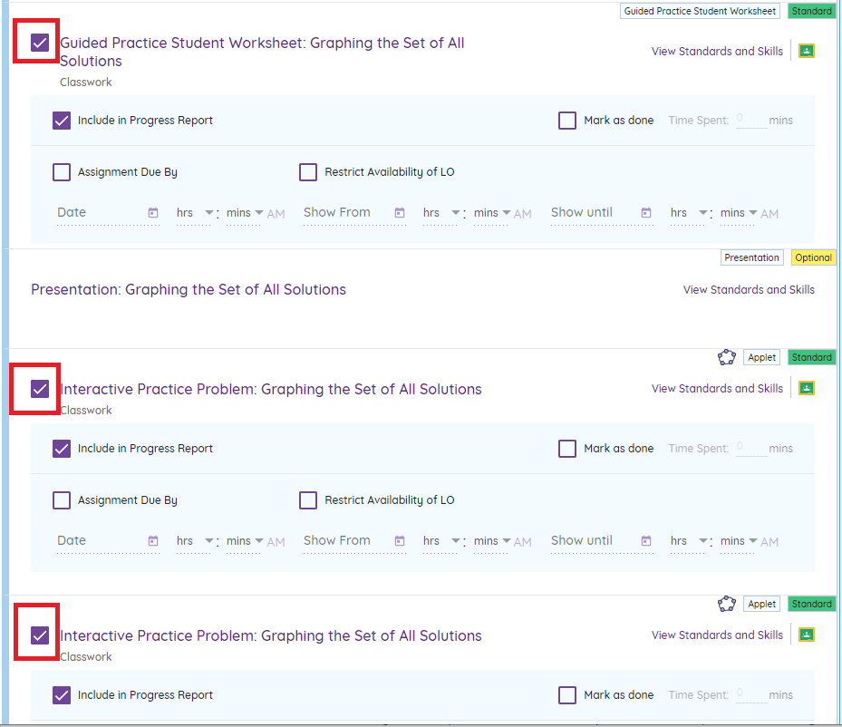 If you use Google Classroom to manage assignments in your class, standard and optional learning objects can all be shared to your Google Classroom class and appear as assignments under Classwork and Stream (if you allow Classwork notifications on the Stream).